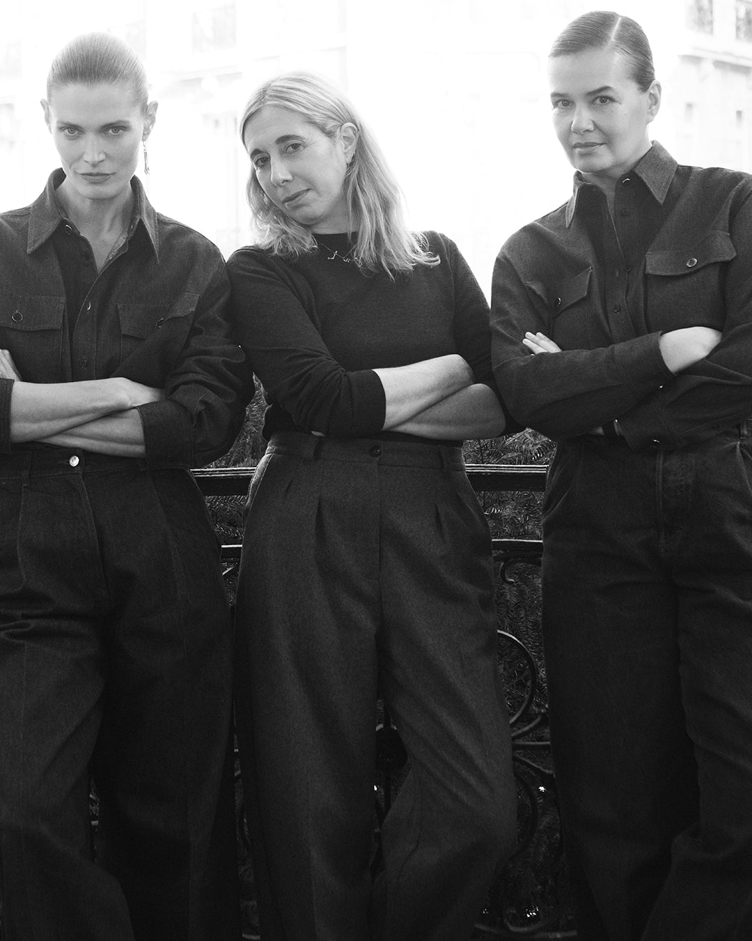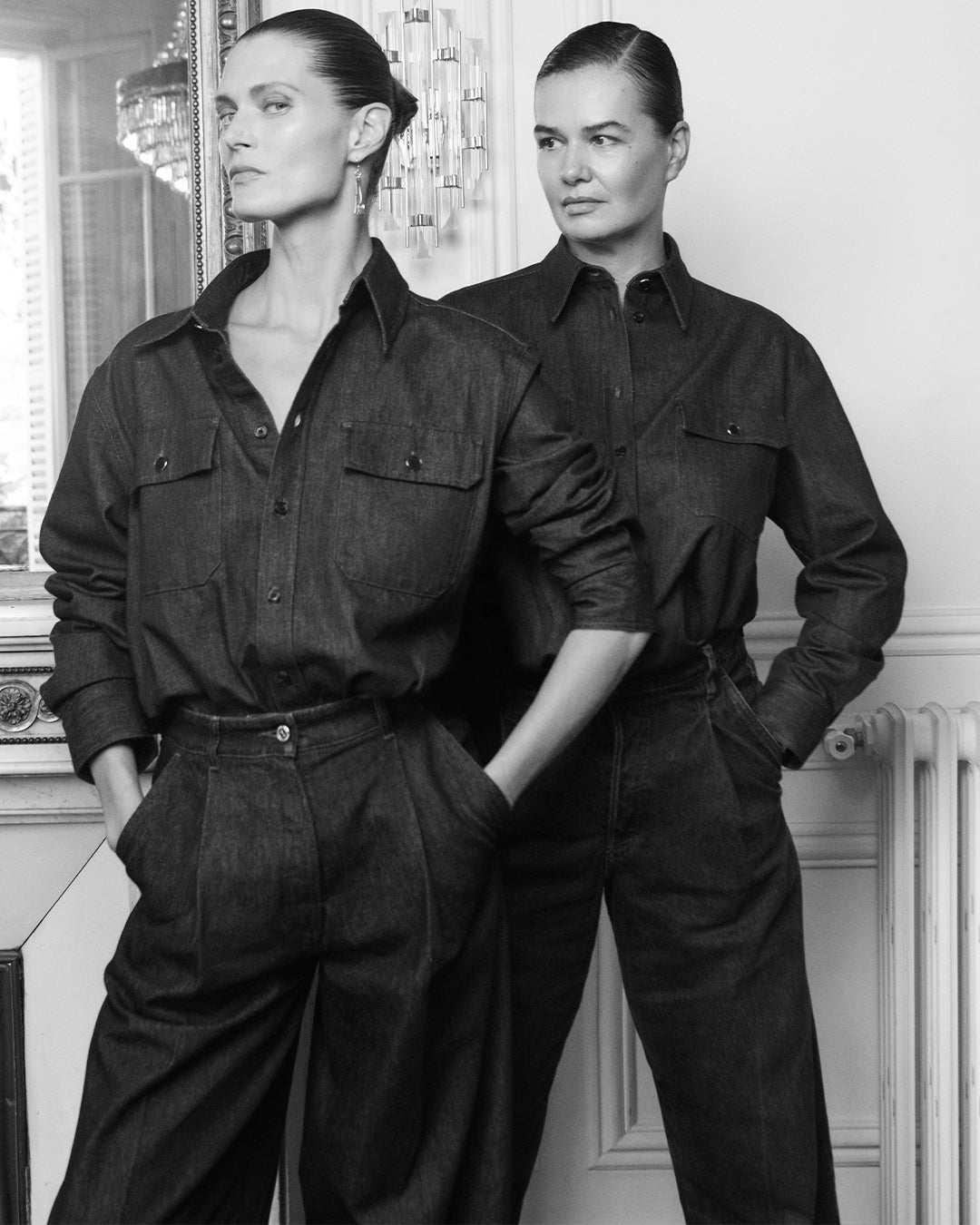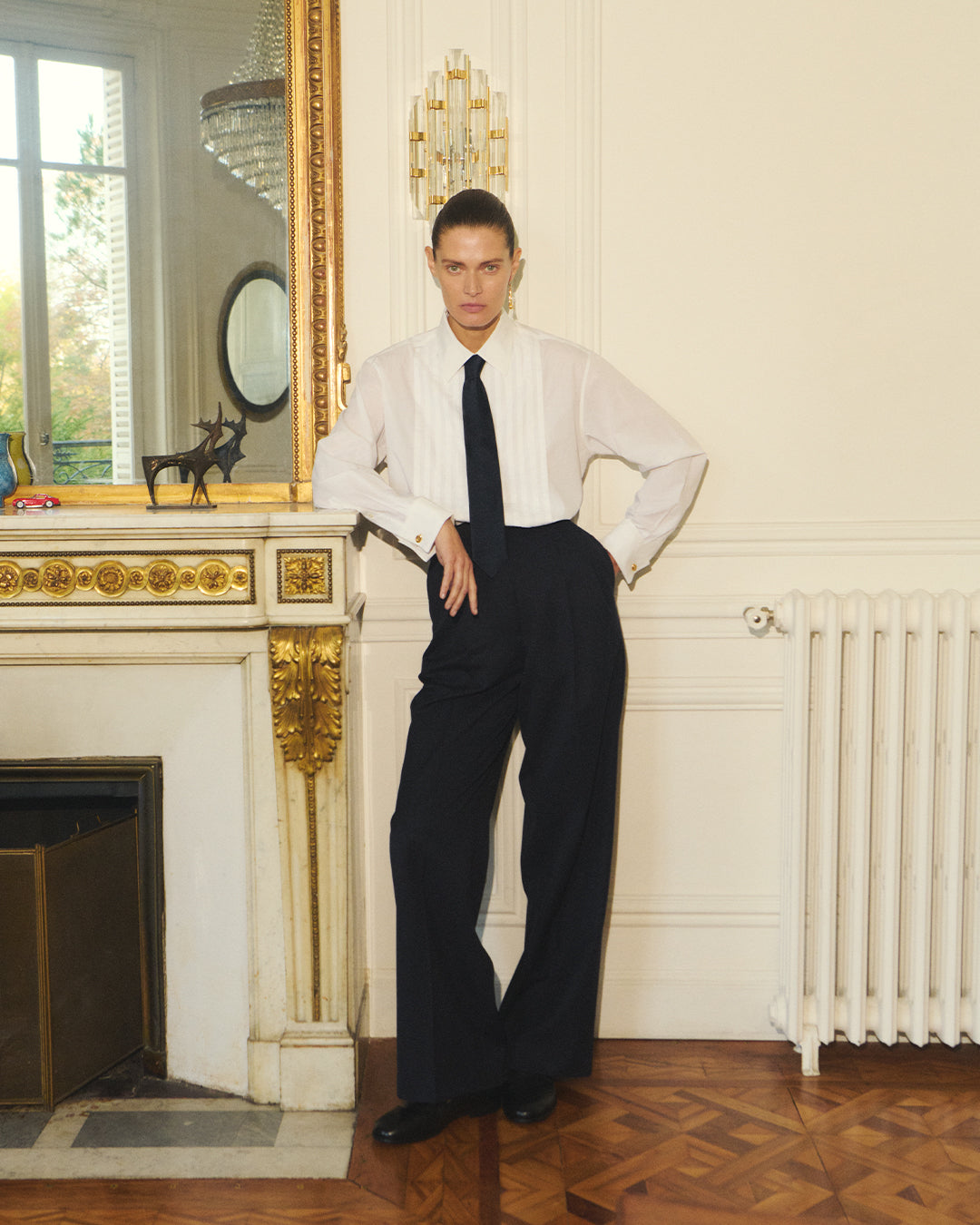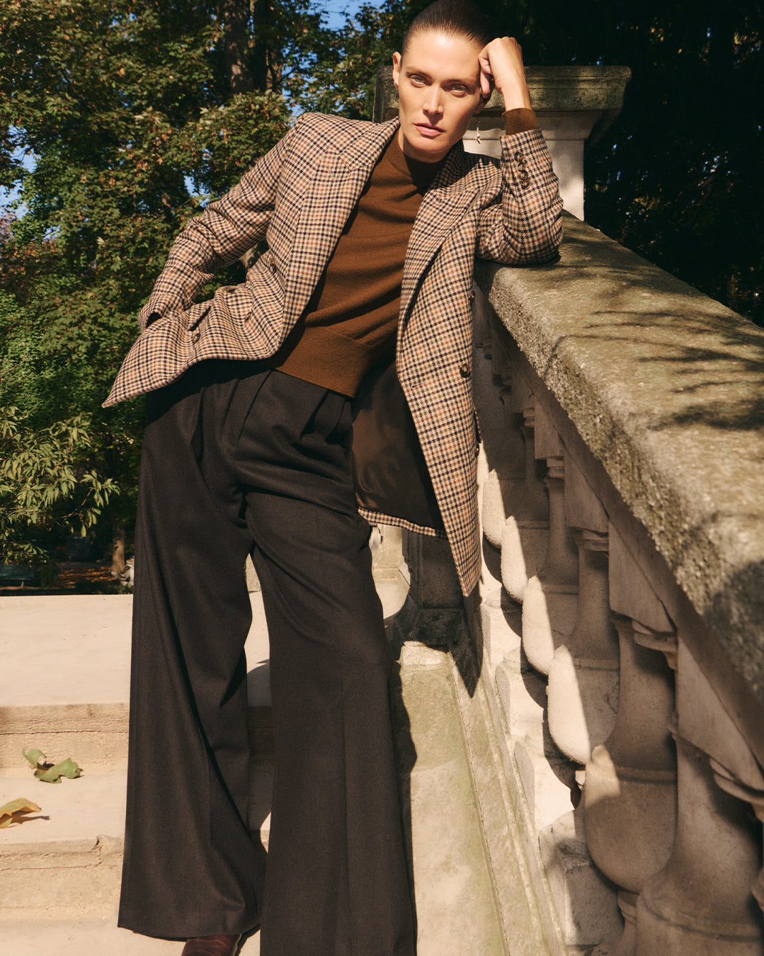 AB: I wanted to offer jackets that could be worn all day long and paired with wardrobe classics: tuxedo shirts in striped poplin or faded denim, cashmere sweaters, wide-leg trousers. I also worked on double denim to create a casual uniform silhouette and a tuxedo you can wear from morning to night. I also imagined a midnight-blue double-breasted wool gabardine blazer that could be worn in the city or on a boat, with buttons emblazoned with my family crest - a tribute to my parents’ style. Finally, the double-breasted checked wool gabardine jacket reminds me so much of the look of characters in Italian movies with Marcello Mastroianni or Ugo Tognazzi, as well as American actresses like Gena Rowlands or Diane Keaton.