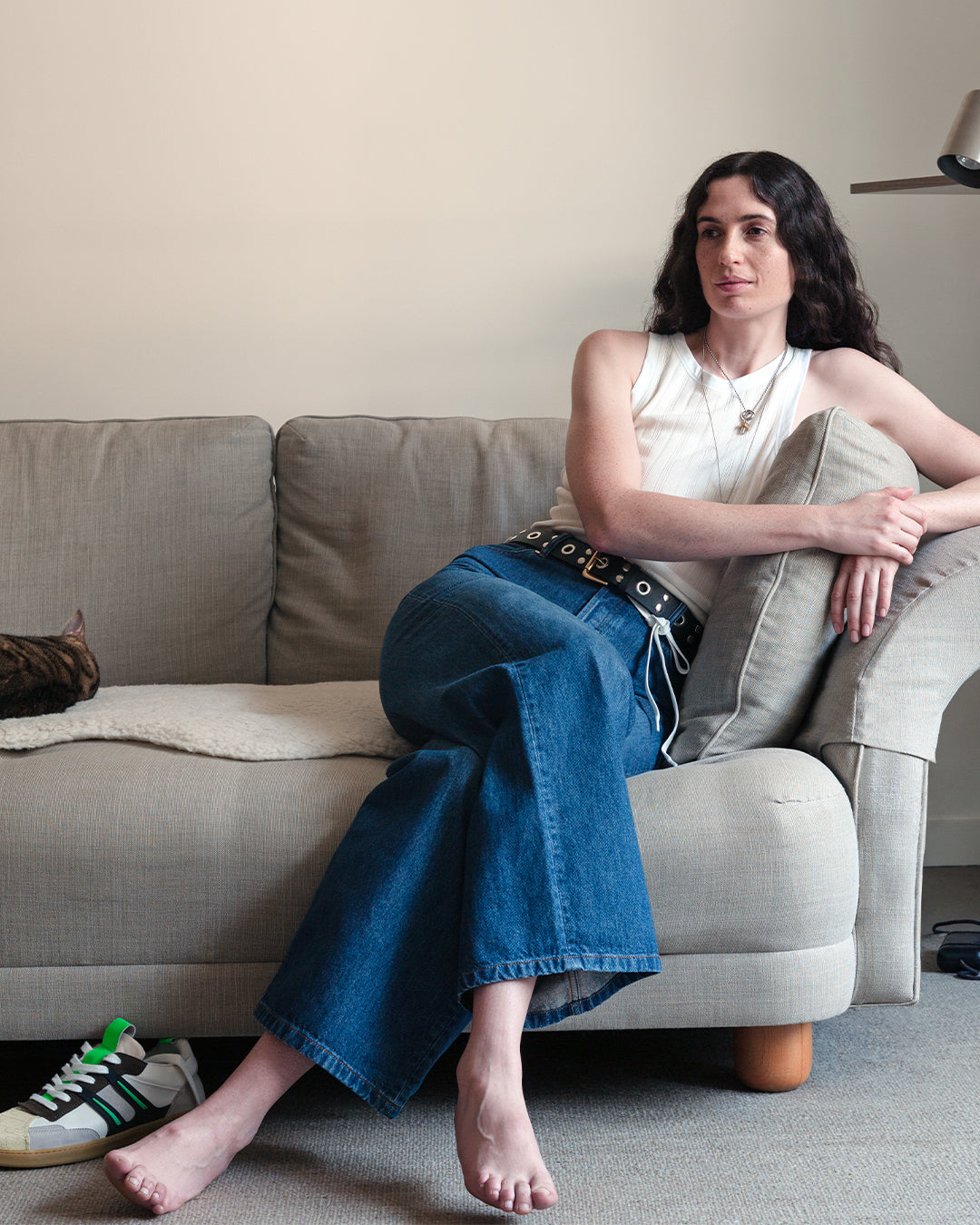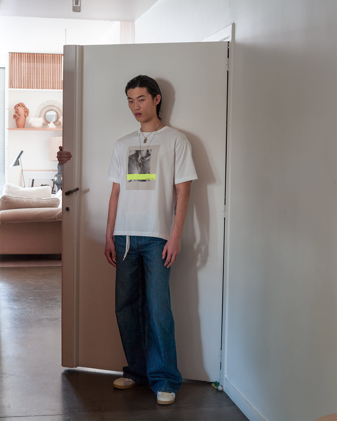 She reworks another A.P.C. wardrobe staple, the jean, with two models: Clinteau, with its high, fitted waist, long, flared leg and quilted pleat detail on the front, or Madame Santeuil, mid-rise waist, wide leg, with a white tie at the waist, evocative of the 1970s.