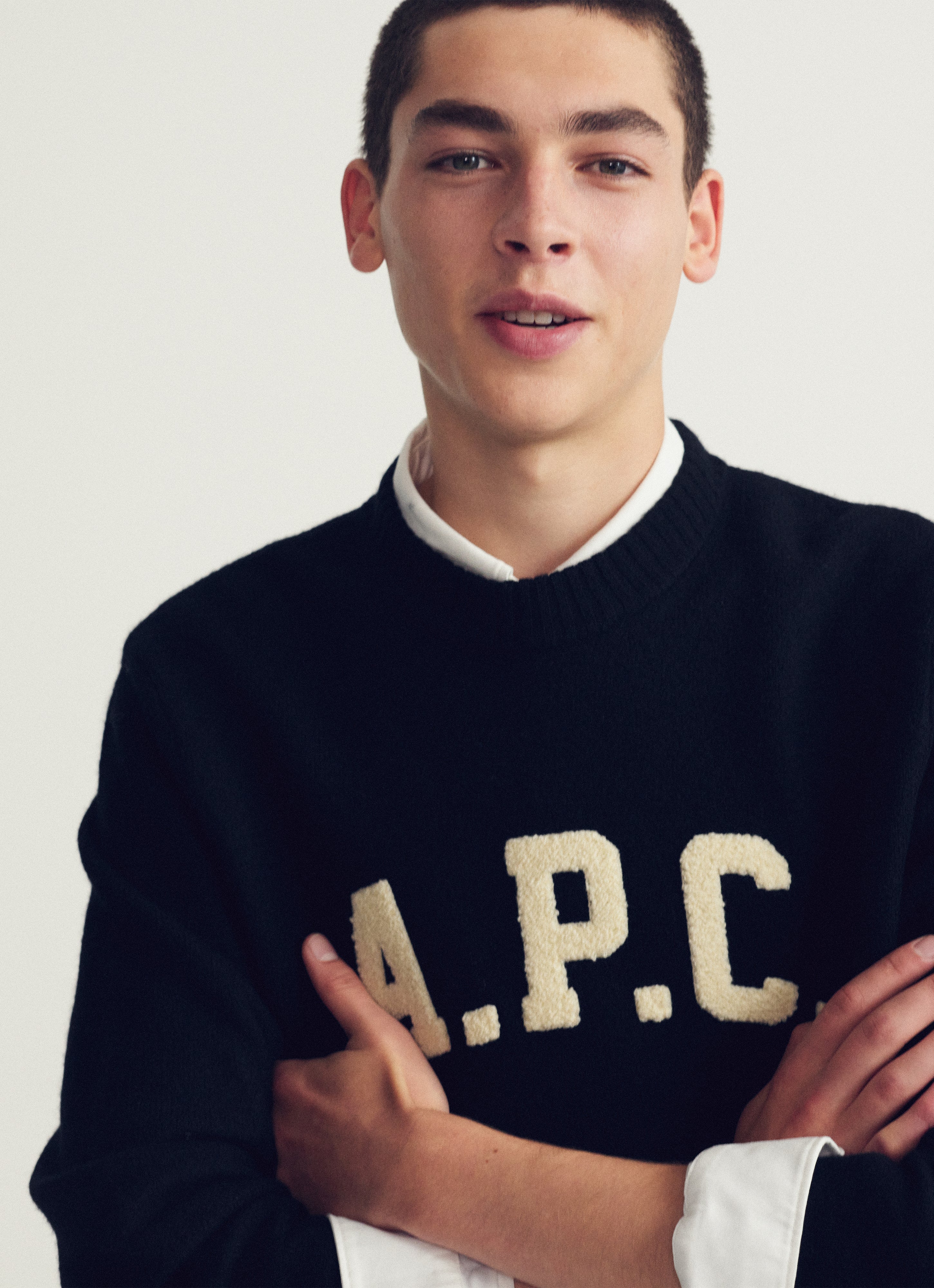 Black jumper with varsity-style A.P.C. logo.
