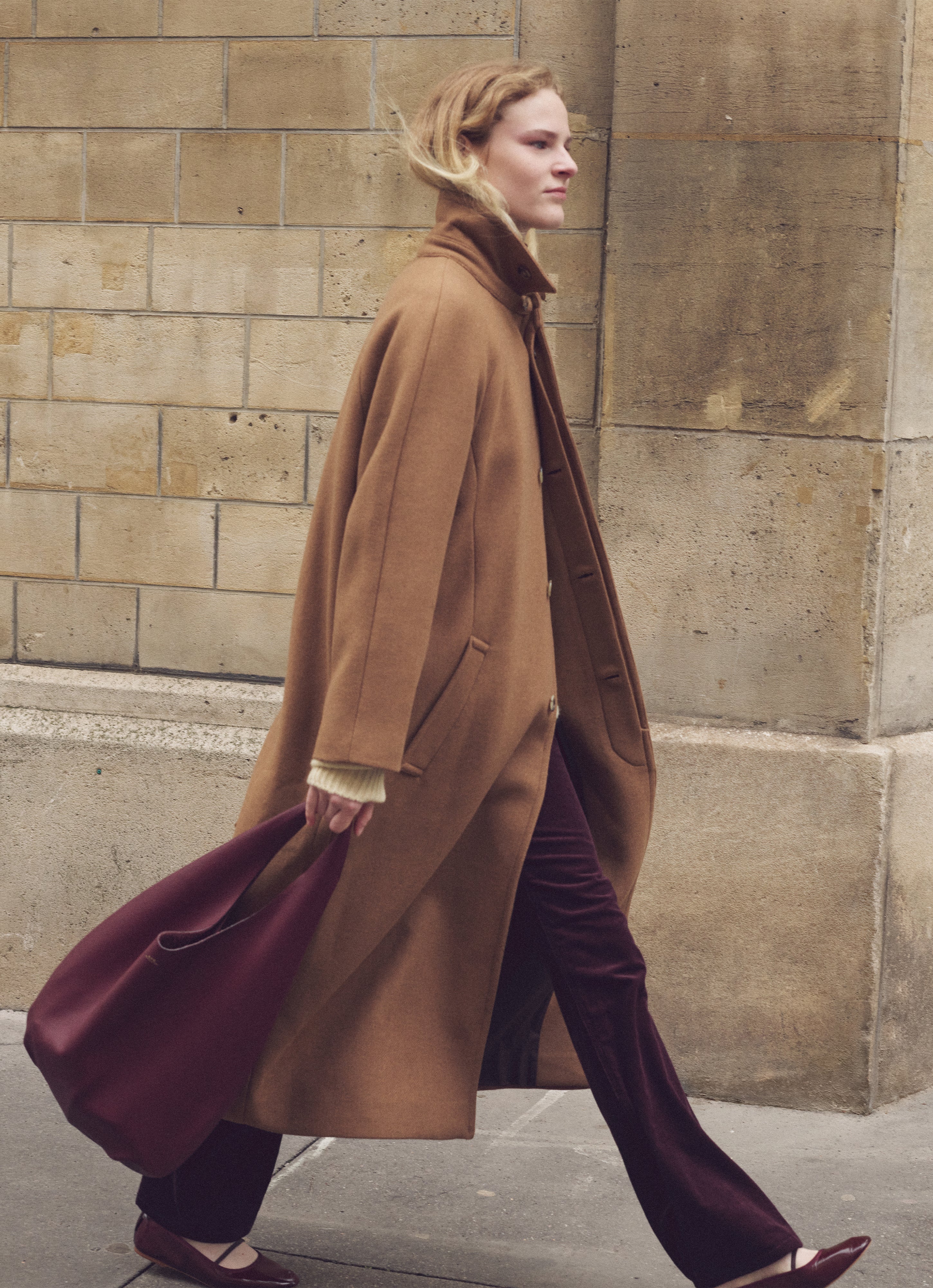Long, wide-leg camel trousers.